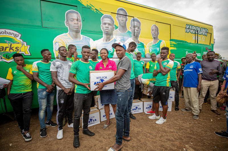 Kariobangi Sharks players and officials when they partnered with SportPesa’s Kits for Africa to distribute football gear to various teams in Nairobi. [Courtesy]