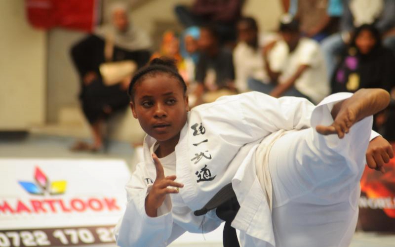 Fatuma Ali from Kenya displays some katas during the opening of the 2018 Mombasa Open Tong-il Moo-do championship at the Aga Khan Academy hall, Sept 09, 2018. [PHOTO BY GIDEON MAUNDU/STANDARD].