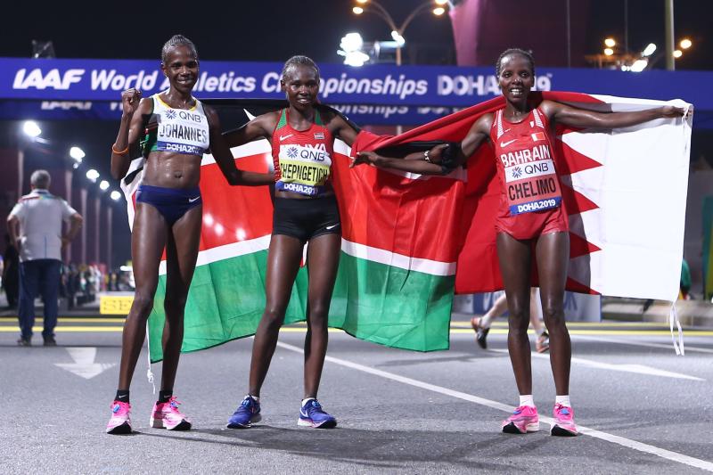 Kenya's Ruth Chepngetich (C) celebrates winning gold with Bahrain's Rose Chelimo (R) in silver and Namibia's Helalia Johannes in bronze after the Women's Marathon at the 2019 IAAF World Athletics Championships in Doha on September 27, 2019. [AFP]
