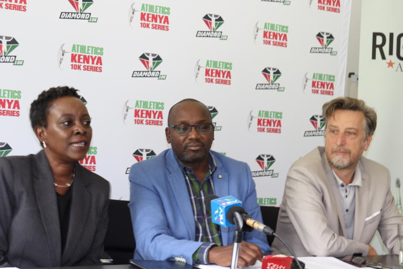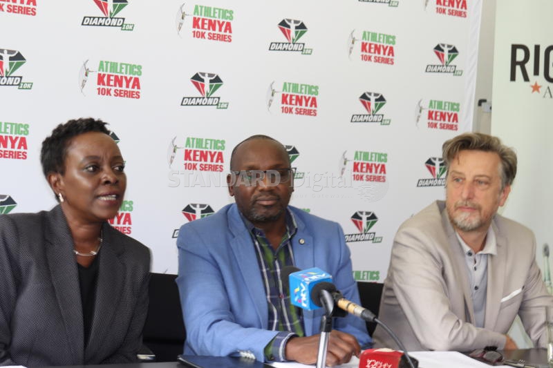 From left: Right Here-Golazo Managing Director Betty kairo, Athletics kenya's Barnaba Korir and Jimmy Geeraerts during the launch of Diamond 10k Run Nairobi. [Courtesy]