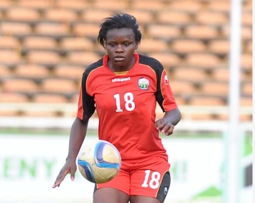 Harambee Starlets Odhiambo Vivian Corazone Aquino against Algeria during CAF women Africa cup of nation qualifiers at Kasarani Stadium on Tuesday 12/04/16. [PHOTO.BONIFACE OKENDO]