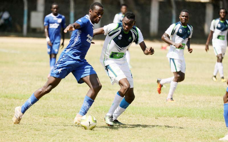 Brian Otieno (left) of Bandari and Michael Mutinda of KCB fight for control of the ball during a Kenyan Premier League match at Mbaraki Sports Club in Mombasa yesterday [Omondi Onyango/Standard]
