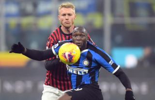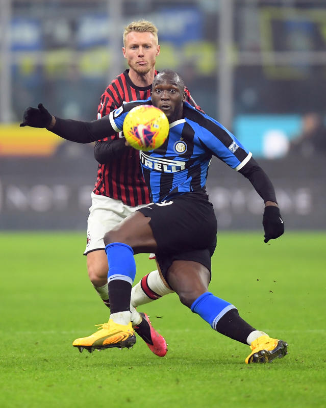 Soccer Football - Serie A - Inter Milan v AC Milan - San Siro, Milan, Italy - February 9, 2020 Inter Milan's Romelu Lukaku in action with AC Milan's Simon Kjaer [REUTERS/Daniele Mascolo]