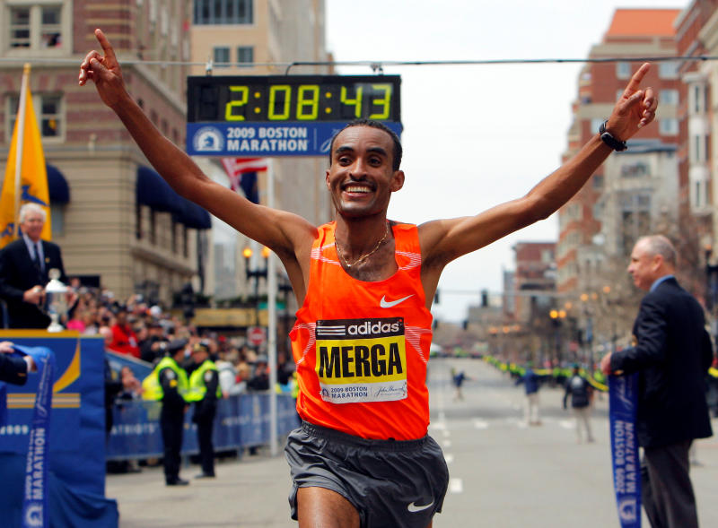 ON THIS DAY Ð APRIL 20 April 20, 2009 MARATHON - Deriba Merga of Ethiopia crosses the finish line to win the men's division of the 113th Boston Marathon. Merga finished in two hours, eight minutes and 42 seconds ahead of Kenya's Daniel Rono and the United States' Ryan Hall. Merga's triumph also broke a three-year winning streak for Kenya's Robert Kipkoech Cheruiyot. [REUTERS/Brian Snyder/File Photo]