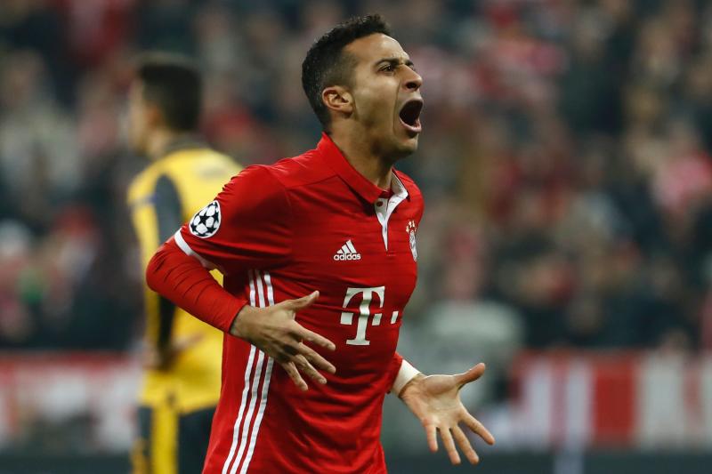 Bayern Munich's Spanish midfielder Thiago Alcantara celebrate scoring during the UEFA Champions League round of sixteen football match between FC Bayern Munich and Arsenal in Munich, southern Germany, on February 15, 2017. / AFP PHOTO / Odd ANDERSEN