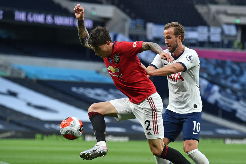 Manchester United's Swedish defender Victor Lindelof (L) vies with Tottenham Hotspur's English striker Harry Kane (R) during the English Premier League football match between Tottenham Hotspur and Manchester United at Tottenham Hotspur Stadium in London, on June 19, 2020. (Photo by Glyn KIRK / POOL / AFP)