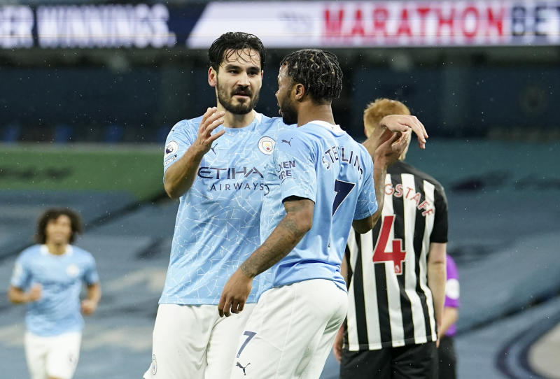 Manchester City's Ilkay Gundogan celebrates with Raheem Sterling, right, after scoring the opening goal during the English Premier League soccer match between Manchester City and Newcastle United at the Etihad stadium in Manchester, Saturday, Dec. 26, 2020. (AP)