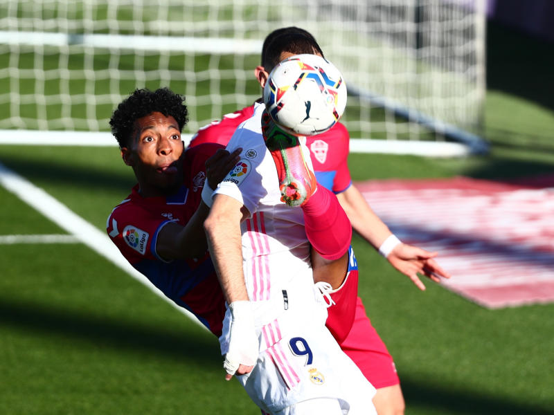 Football - La Liga Santander - Real Madrid v Elche - Estadio Alfredo Di Stefano, Madrid, Spain - March 13, 2021 Real Madrid's Karim Benzema in action with Elche's Johan Mojica. [REUTERS/Sergio Perez]