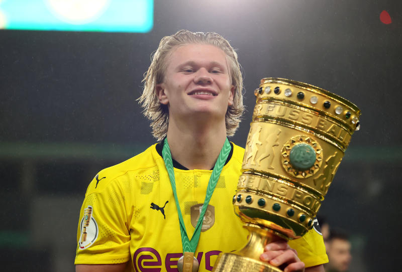 Borussia Dortmund's Erling Braut Haaland celebrates winning the DFB Cup with the trophy [Reuters, Martin Rose]