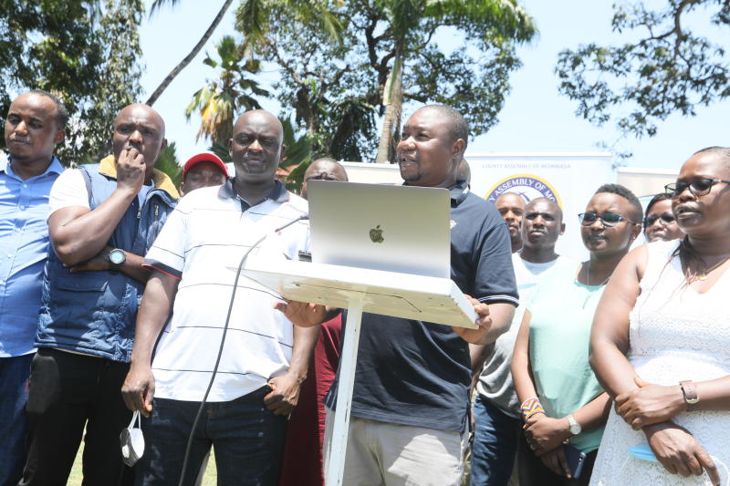 Members of County assemblies Sports Association led by Mombasa County chief officer for tourism, Innocent Mugabe address the press at Mombasa Sports club. They prepare for inter County sports which starts this Monday in Mombasa. 29th October 2021.[Omondi Onyango, Standard]