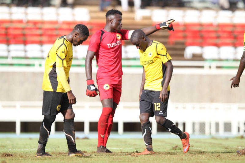 FILE Tusker FC’s Goalkeeper Patrick Matasi (centre) instructing colleagues during Kenya Premier league match against AFC Leopards at The Moi International Sports centre, Kasarani. April 24, 2022. [Jonah Onyango, Standard]