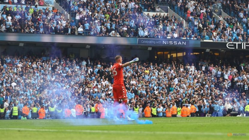 May 22, 2022 Aston Villa's Robin Olsen reacts as a flare is thrown onto the pitch after Manchester City score their second goal REUTERS