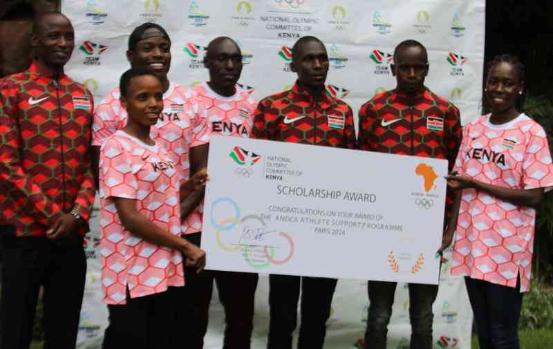 From left: Kenyan athletes Charles Simotwo, Beatrice Chebet, Ferdinand Omanyala, Abel Kipsang, Nicholas Kimeli, Jacob Krop and Margaret Chelimo after receiving cheques from sponsors to help them prepare for Paris 2024 Olympic in Eldoret, Uasin Gishu County yesterday. [Peter Ochieng, Standard]