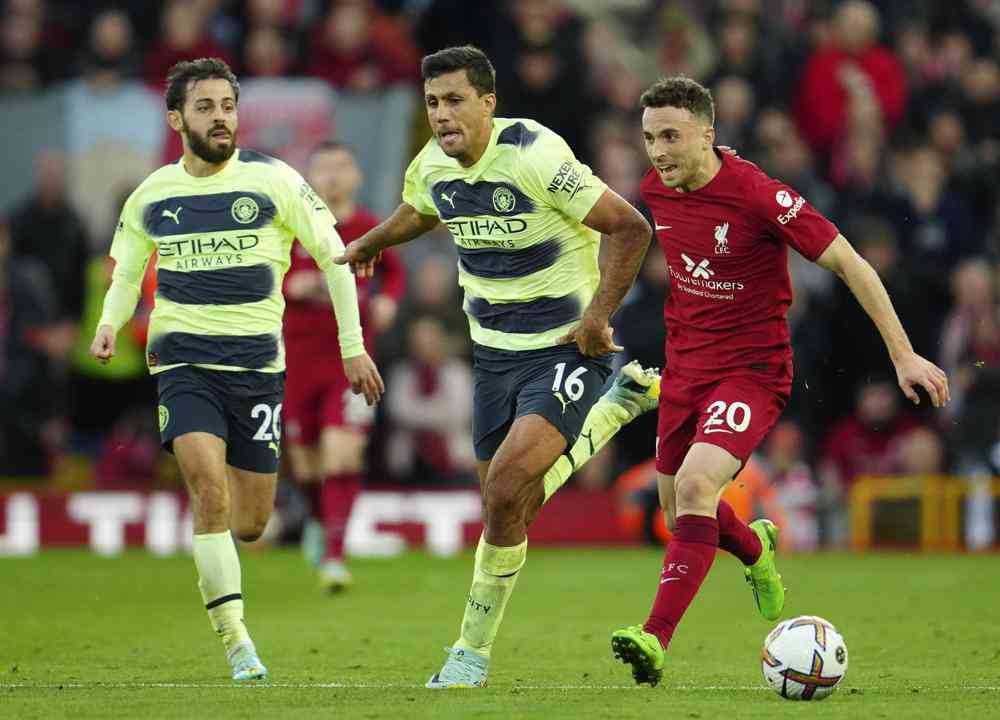 Liverpool's Diogo Jota, right, duels for the ball with Manchester City's Rodrigo during the English Premier League soccer match between Liverpool and Manchester City at Anfield stadium in Liverpool, Sunday, Oct. 16, 2022. (AP Photo/Jon Super)
