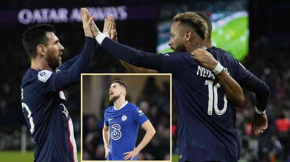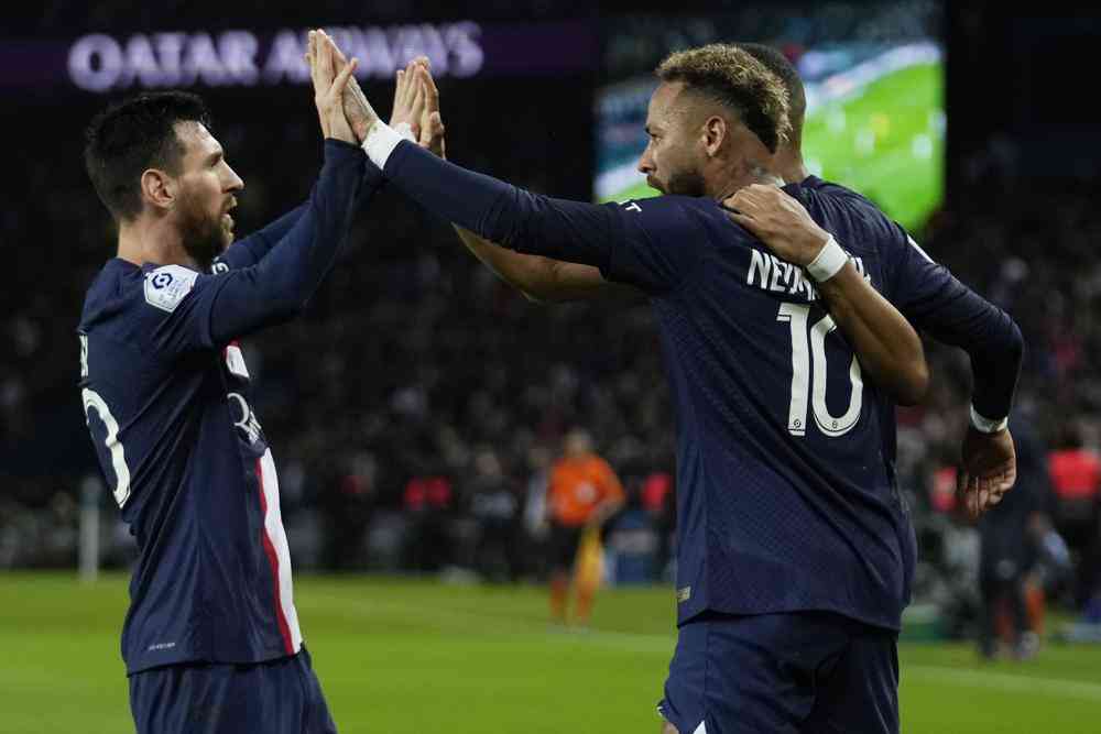 PSG's Neymar, centre, celebrates with Lionel Messi, left, and Kylian Mbappe, right, after scoring the opening goal during the French League One soccer match between Paris Saint-Germain and Marseille at the Parc des Princes in Paris, Sunday, Oct. 16, 2022. (AP Photo/Thibault Camus)
