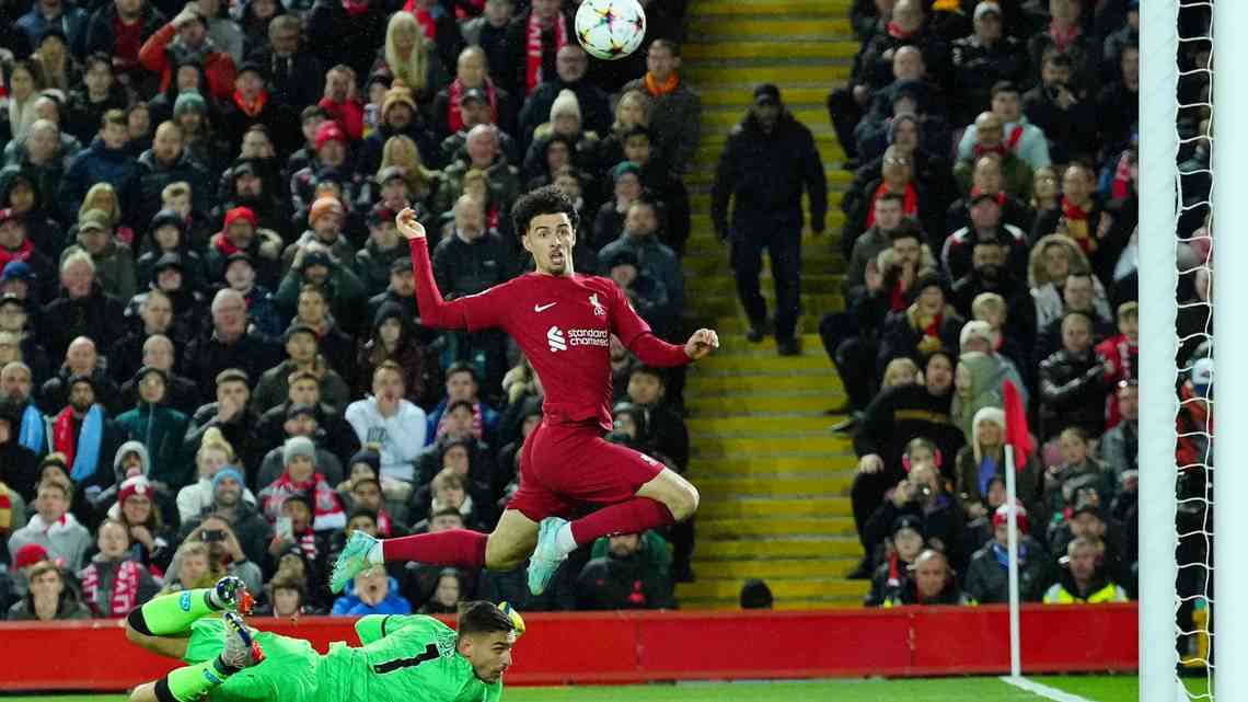 Napoli's goalkeeper Alex Meret makes a save in front of Liverpool's Curtis Jones during the Champions League Group A soccer match between Liverpool and Napoli, at Anfield stadium in Liverpool, England, Tuesday, Nov. 1, 2022. (AP Photo/Jon Super) Jon Super AP