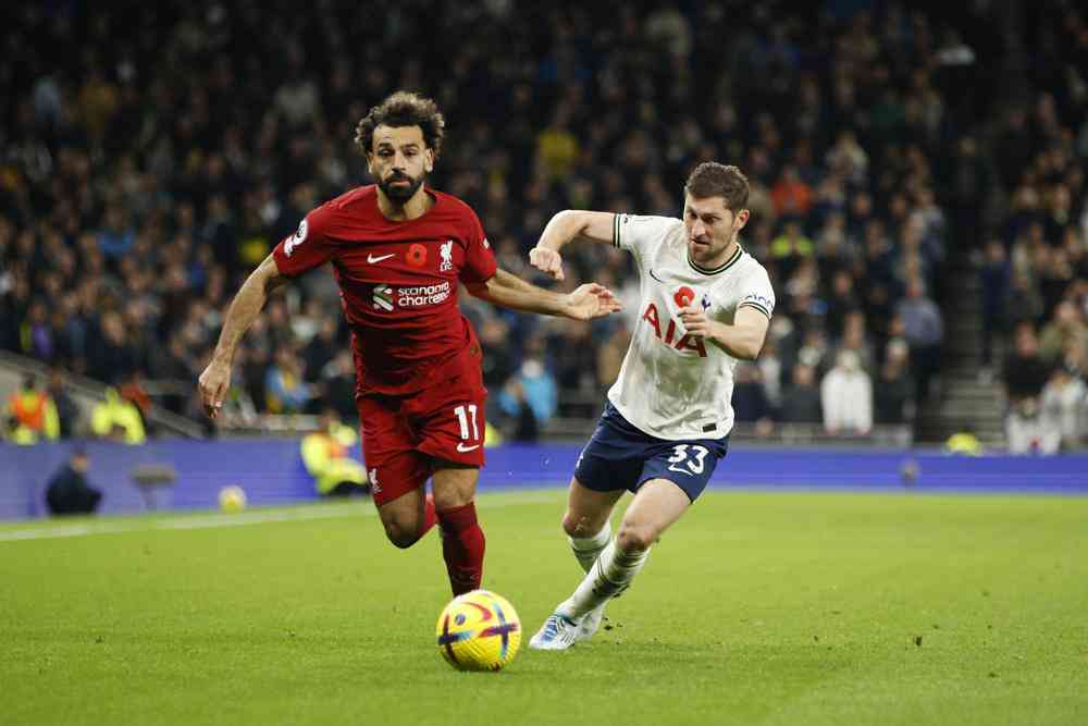 Liverpool's Mohamed Salah, left, challenges for the ball with Tottenham's Ben Davies during the English Premier League soccer match between Tottenham Hotspur and Liverpool at Tottenham Hotspur Stadium, in London, Sunday, Nov. 6, 2022. (AP Photo/David Cliff)