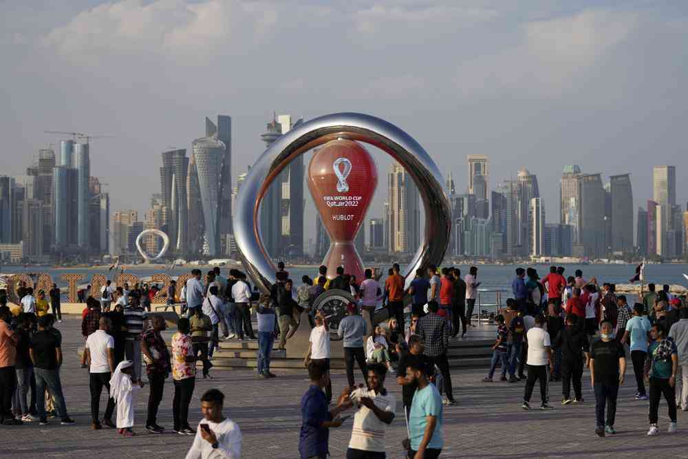 People gather around the official countdown clock showing remaining time until the kick-off of the World Cup 2022, in Doha, Qatar, Friday, Nov. 11, 2022.AP