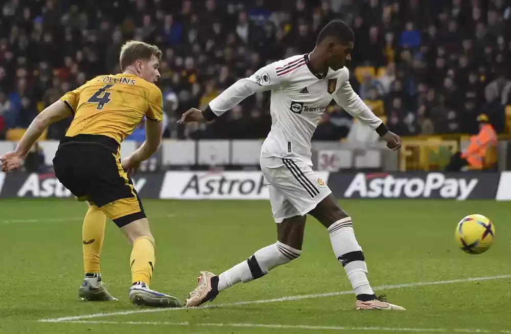 Manchester United's Marcus Rashford, right, scores a disallowed goal during the English Premier League soccer match between Wolverhampton Wanderers and Manchester United at the Molineux Stadium in Wolverhampton, England, Saturday, Dec. 31, 2022. (AP Photo/Rui Vieira)