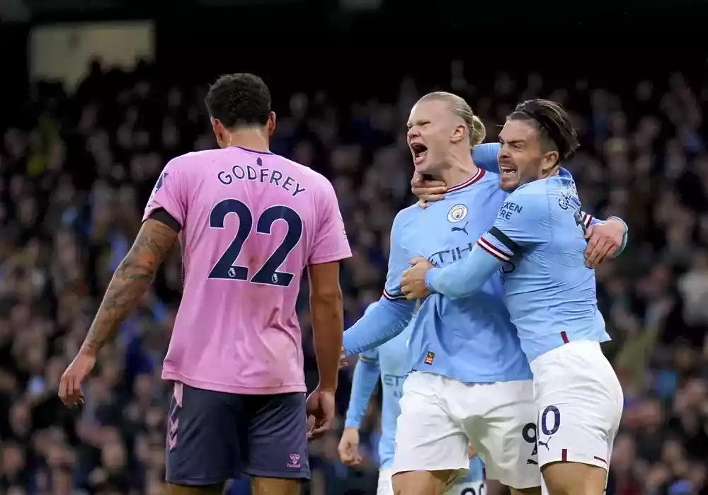 Manchester City's Erling Haaland, centre, celebrates after scoring the opening goal during the English Premier League soccer match between Manchester City and Everton at the Etihad Stadium in Manchester, England, Saturday, Dec. 31, 2022. (Tim Goode/PA via AP)