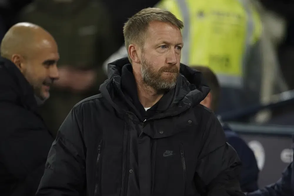 Chelsea's head coach Graham Potter looks on ahead of the English FA Cup soccer match between Manchester City and Chelsea at the Etihad Stadium in Manchester, England, Sunday, Jan. 8, 2023. (AP Photo/Dave Thompson)