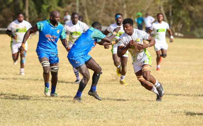 KCB's Forward Elvis Okulusi makes a run past his opponents at the Nakuru Showground during Kenya Cup clash against Menengai Oilers.[Washington Onyango,Standard]