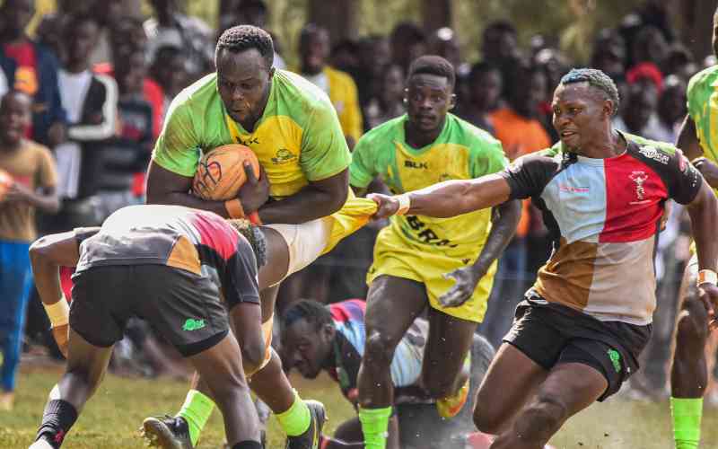 Kabras Sugar's George Nyambua bulldozes past Kenya Harlequin defense in Kenya Cup semifinals.[Washington Onyango,Standard]