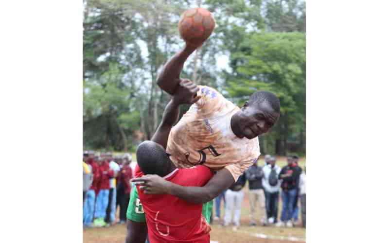 Hospital Hill's Brian Wafula is tackled by Ezra Omoit of Highway during the Nairobi region handball final at Nairobi School yesterday. [Jonah Onyango, Standard]