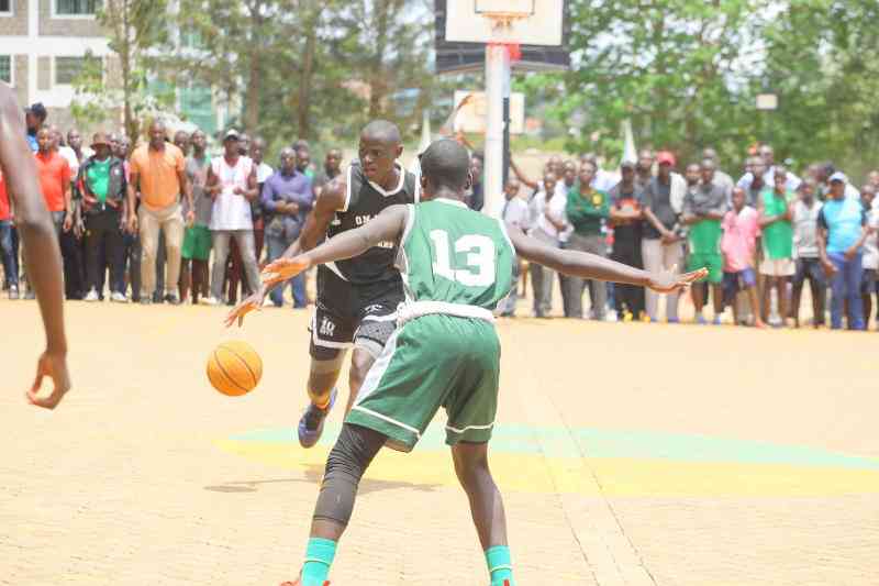 Onjiko High School basketball player (left) in action against Agoro Sare during their Nyanza regional secondary school games final match in Kisii yesterday. [Sammy Omingo, Standard]