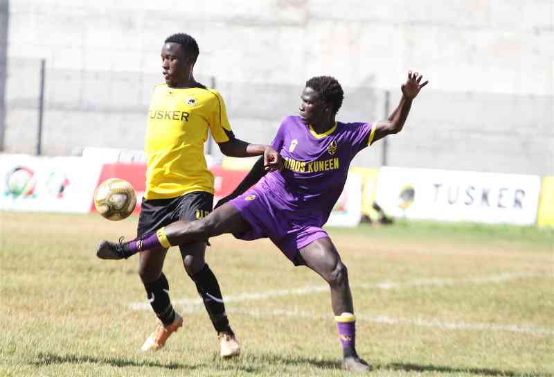 Tusker's Thomas Teka (left) and Christopher Raila of Wazito fc during FkF Premier League at EABL Ruaraka ground. [Jonah Onyango, Standard]