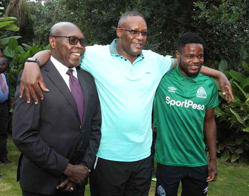 ICT Cabinet Secretary Eliud Owalo (centre) with Gor Mahia chairman Ambrose Rachier and striker Benson Omallo during a breakfast meeting in Nairobi yesterday. [Jonah Onyango, Standard]