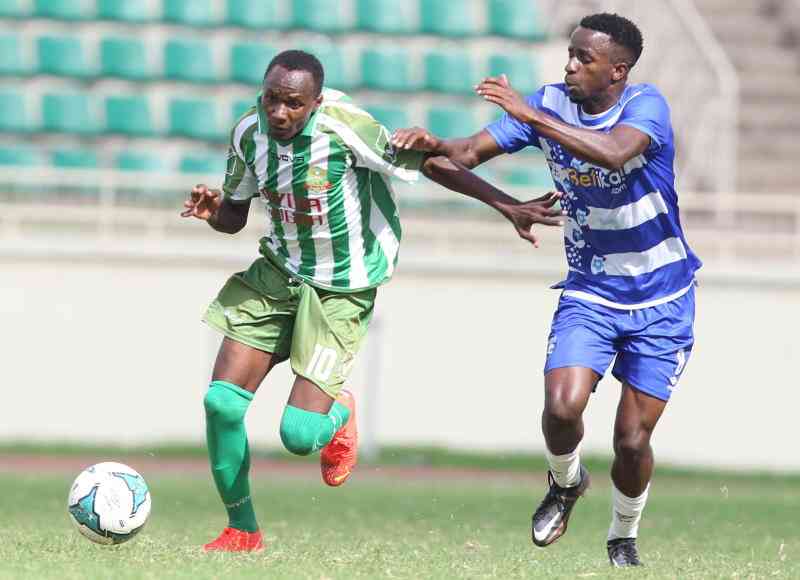 AFC Leopards' Brayan Wanyama and Hassan Beja of Nzoia Sugar in FkF Kenya Premier League at Nyayo National stadium. [Jonah Onyango, Standard]