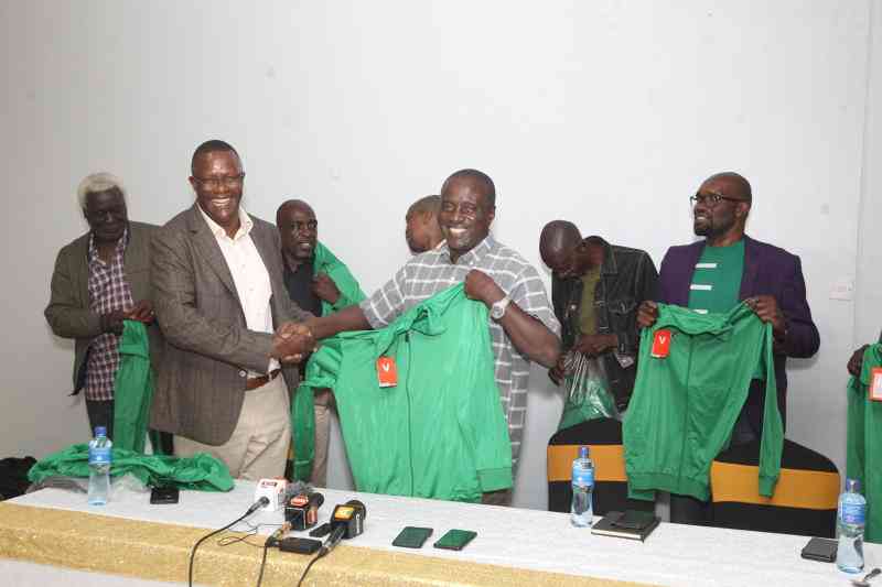 ICT CS Eliud Owalo gives a jersey to former Gor Mahia player Austin Oduor in Nairobi. [Jonah Onyango, Standard]