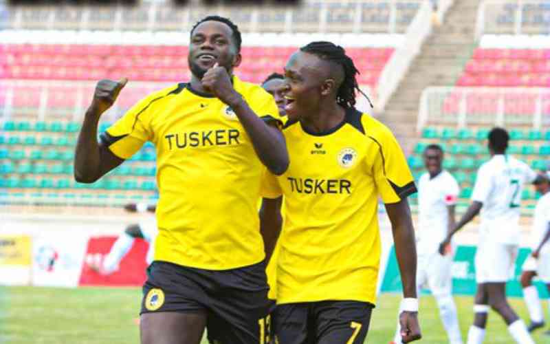 Deogratious Ojok celebrates his goal after scoring against Karionagi Sharks.[Tusker]