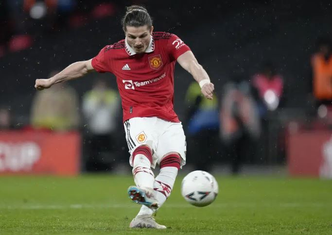 Manchester United's Marcel Sabitzer scores a penalty kick during the English FA Cup semifinal soccer match between Brighton and Hove Albion and Manchester United at Wembley Stadium in London, Sunday, April 23, 2023. (AP Photo/Kirsty Wigglesworth)