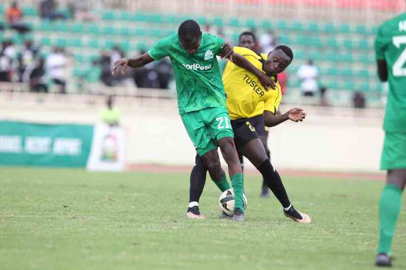 Record holder champions Gor Mahia's Sydney Wahongo (left) and Eric Otieno of the defending champions Tusker FC fight for the 2022-2023 football Kenya Federation Premier League title at Nyayo national stadium. May 28, 2023. [Jonah Onyango, Standard]