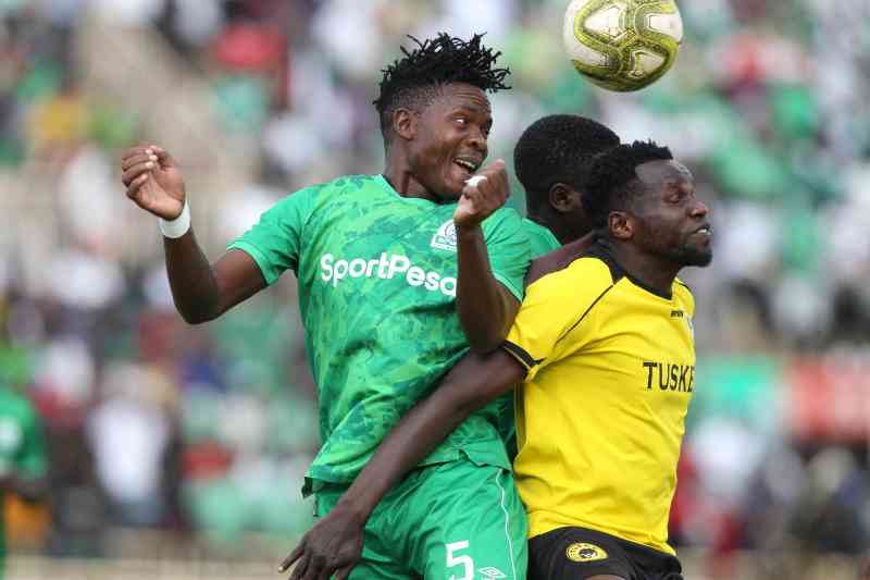 Gor Mahia's George Odhiambo (left) vies for an aerial ball with Tusker's Kevin Monyi during their FKF PL match at Nyayo Stadium on May 28. [Jonah Onyango, Standard]