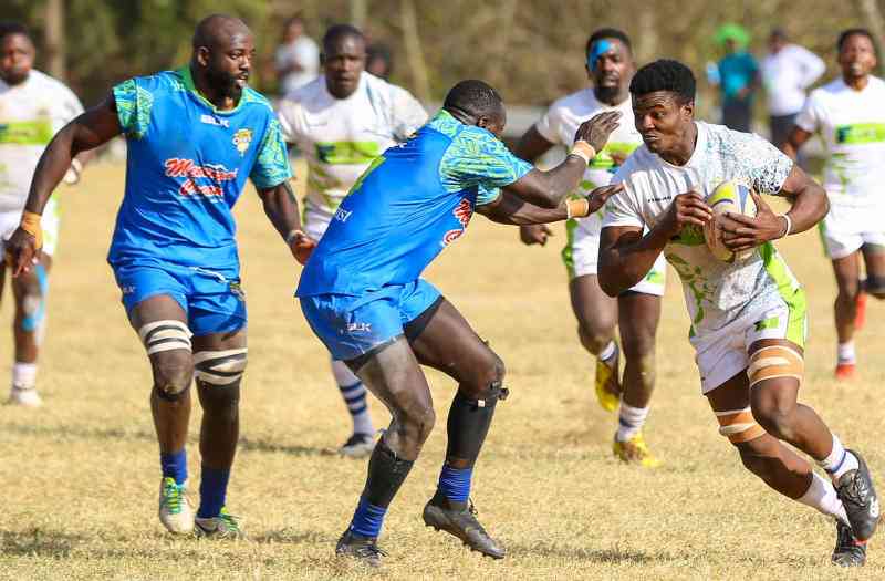 KCB's Forward Elvis Okulusi (right) makes a run past Menengai Oilers at the Nakuru Showground during Kenya Cup clash. [Jonah Onyango, Standard]