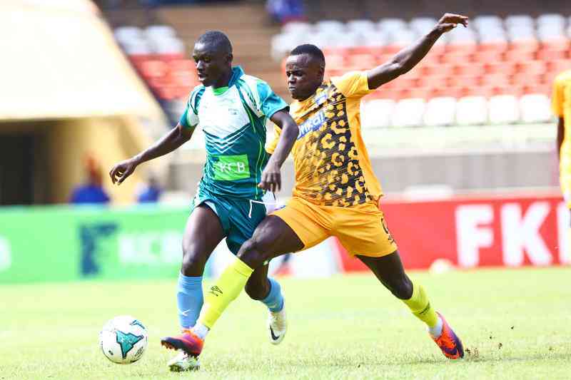 KCB's Kennedy Owino (L) is challenged by AFC Leopards SC Musa Oundo during their FKF Premier League match at Nyayo National Stadium on February 26, 2023. [Jonah Onyango]