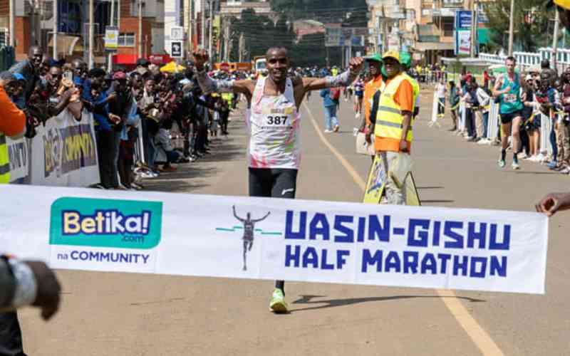 Peter Mwaniki crosses the finish line at the Uasin Gishu Half Marathon that took place in Eldoret on Sunday, 13 August 2023. Betika Na Community will be hosting another Half Marathon this Sunday in Eldoret. [Courtesy]