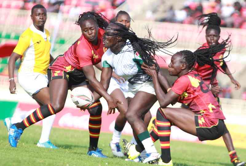 Grace Adhiambo (center) of is tackled by Uganda's dou Zindale Masuku (left) and Aphiwe Ngwevu during the 23rd Edition 2021 Safari 7s tournament at The Nyayo National stadium on Saturday. [Jonah Onyango, Standard] .