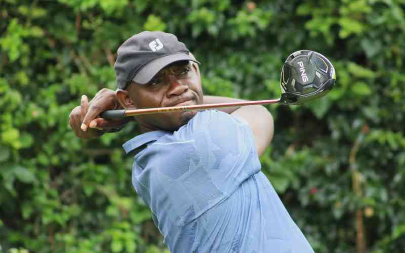 Pro Kevin Mabele of Karen Golf and Country Club in action on the par-five 18th at Muthaiga Golf Club in Nairobi, April 19, 2024, during Mulembe Alpha tournament. [Mose Sammy, Standard]