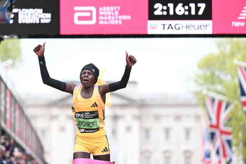 Kenya's Peres Jepchirchir crosses the line to win the women's race in a world record time for a women's only race at the 2024 London Marathon in central London on April 21, 2024.[AFP]