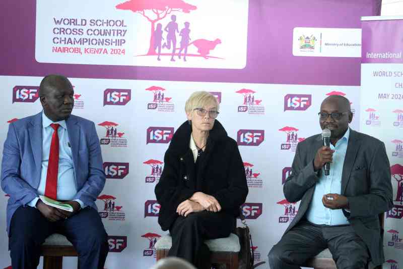 Nelson Sifuna, Director Field Co-ordination and Co-Curriculum activities at the Ministry of Education (left) ISF World School cross country championships 2024 official Liz Mccolgan and Local Organising Committee CEO Barnabas Koriri CEO. [Jonah Onyango, Standard]