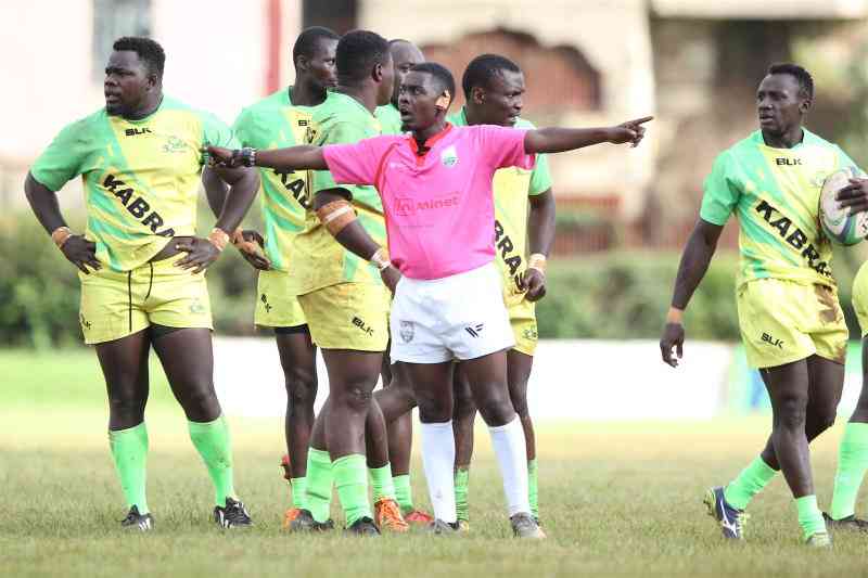 Kabras Sugar and KCB players get instructions from referee Duncan Kioko officiating Enterprise Cup 2023 finals at RFUEA. April 15, 2023. [Jonah Onyango, Standard]