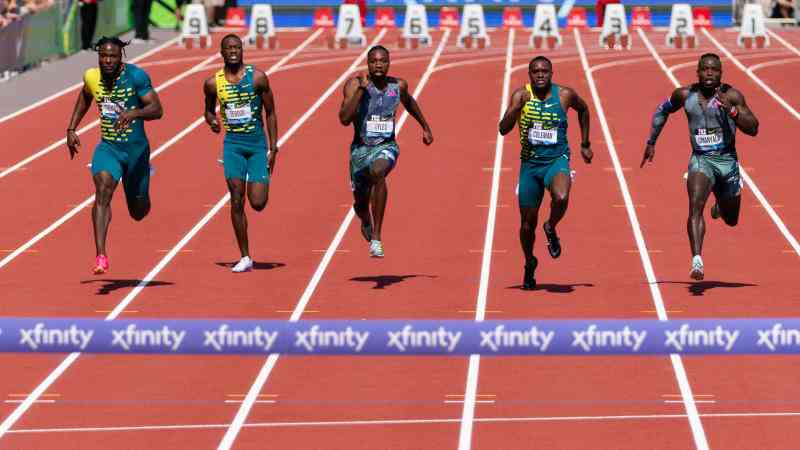 (From left to right) Kishane Thompson of Jamaica, Letsile Tebogo of Botswana, Noah Lyles of the United States, Christian Coleman of the United States, and Ferdinand Omanyala of Kenya compete in the Men's 100m during the 2023 Prefontaine Classic and Wanda Diamond League Final at Hayward Field on September 16, 2023 in Eugene, Oregon. [AFP]