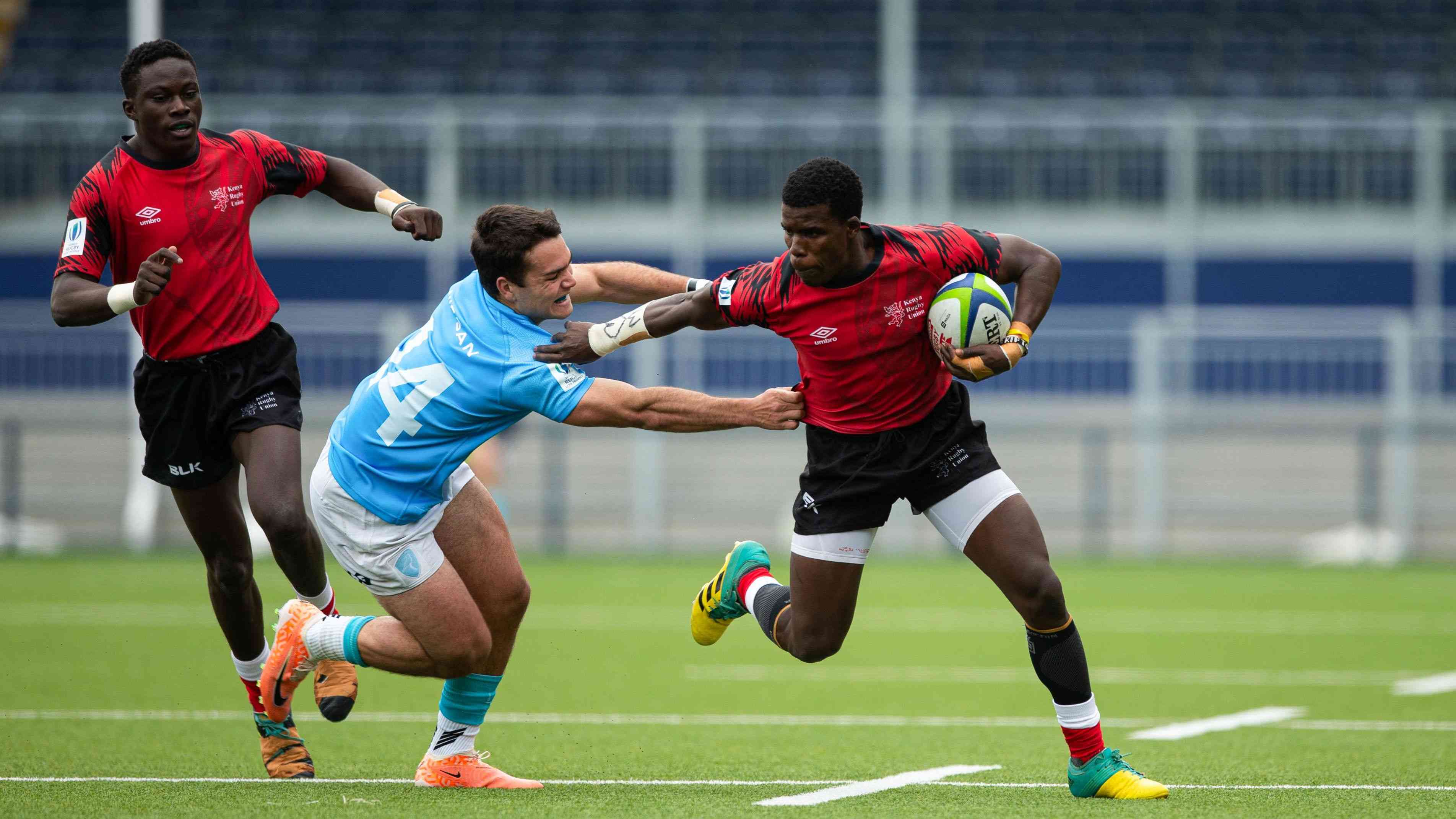 Uruguay's Francisco Garayalde and Kenya's Brian Kiptanui (right) in action during a World Rugby U20 Trophy 2024 match at the Hive Stadium in Edinburgh, Scotland. [World Rugby]