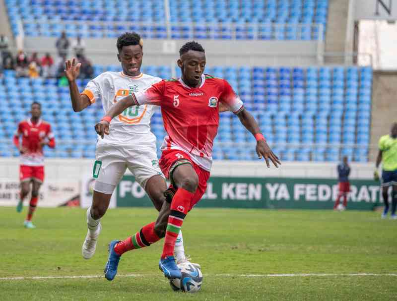 Harambee Stars defender Alphonse Omija dribbles past Simon Adingra of Ivory Coast during the 2026 World Cup qualifier at Bingu National Stadium, Lilongwe on June 11. [FKF Media]