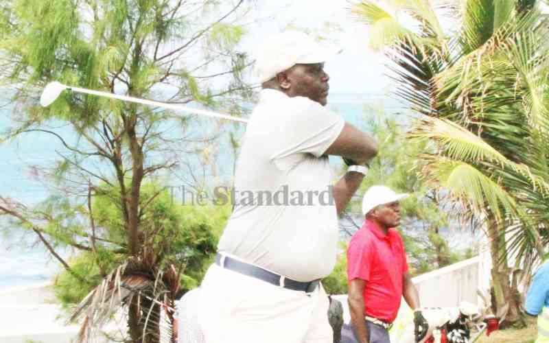 Paul Koech, winner of the Tea Golf Day makes a swing to the second greens during the tourney at the Sea-Link Mombasa Golf Club in Mombasa County on Saturday. [Maarufu Mohamed, Standard]