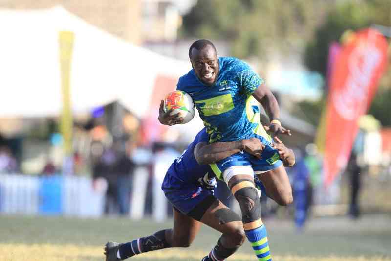 Strathmore Leos' Stephene Osumba tackle Elphas Adunga of KCB during the 2023 Christie 7s at RFU grounds. [Jonah Onyango, Standard]